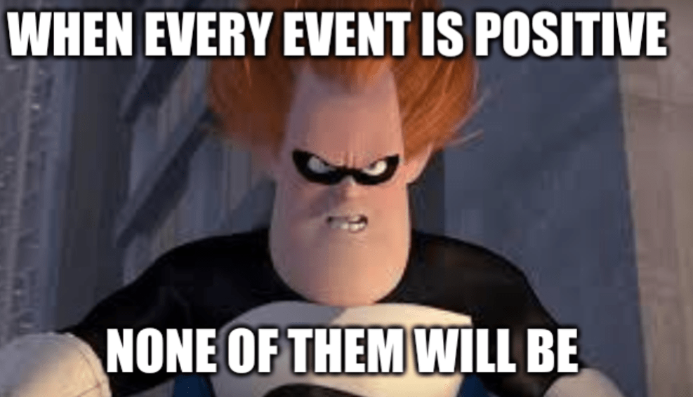 But now, looking at this prompt, I’m seeing that in doing this ‘silver lining’ perspective so often I elevate the negative events which makes them seem less bad, and subsequently I am mentally devaluing positive events a bit. Balancing everything like this makes it hard to pinpoint a memory of something I could talk about as a “positive event”. It’s like that meme of Syndrome from The Incredibles.