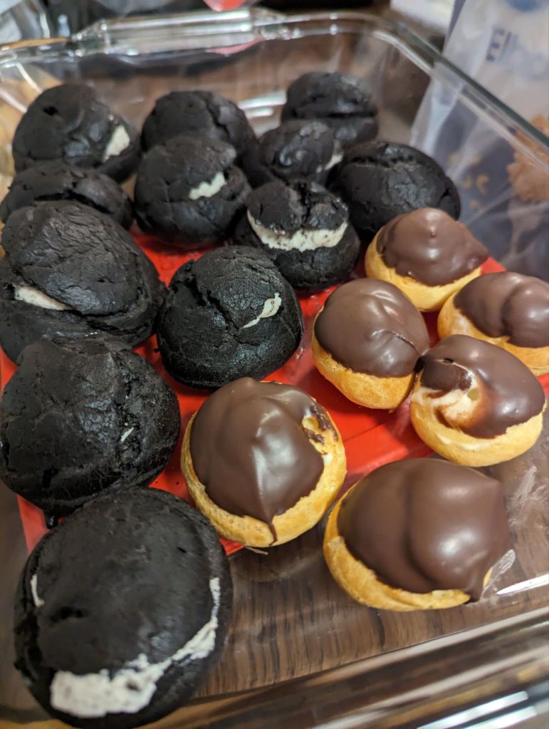 Eventually, over the course of about 4-5 hours of baking and experimenting, I did end up with very dark cream puffs that tasted very much like the cookie part of an Oreo. It was about 1:00AM at this point so I put everything away and saved the regular choux dough for the next afternoon before the party.