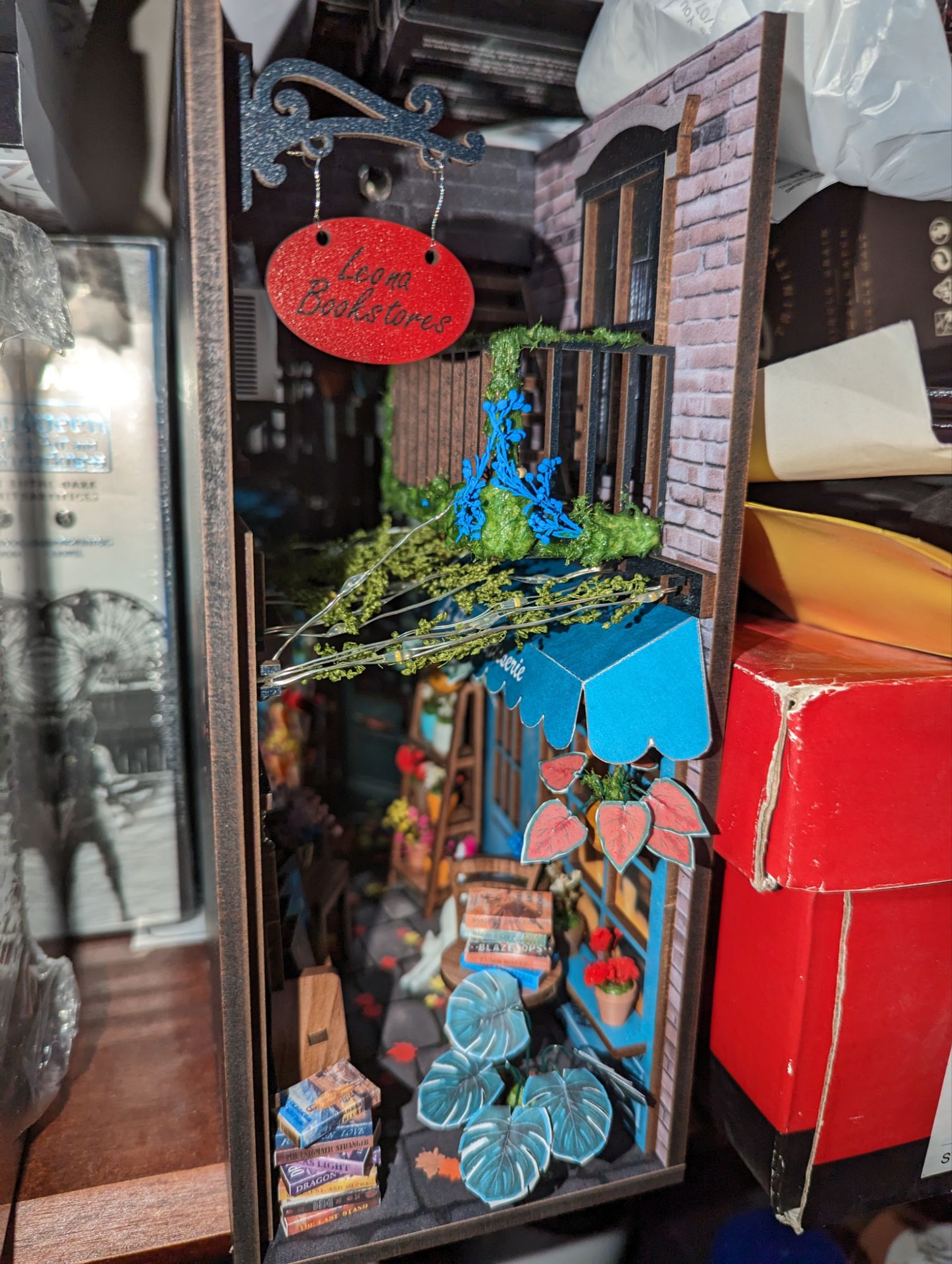 There’s a little mirror acting as the back wall to create the illusion of further depth and to see the other shop door correctly (it was designed to be mirrored.)