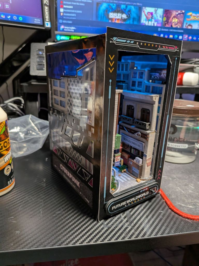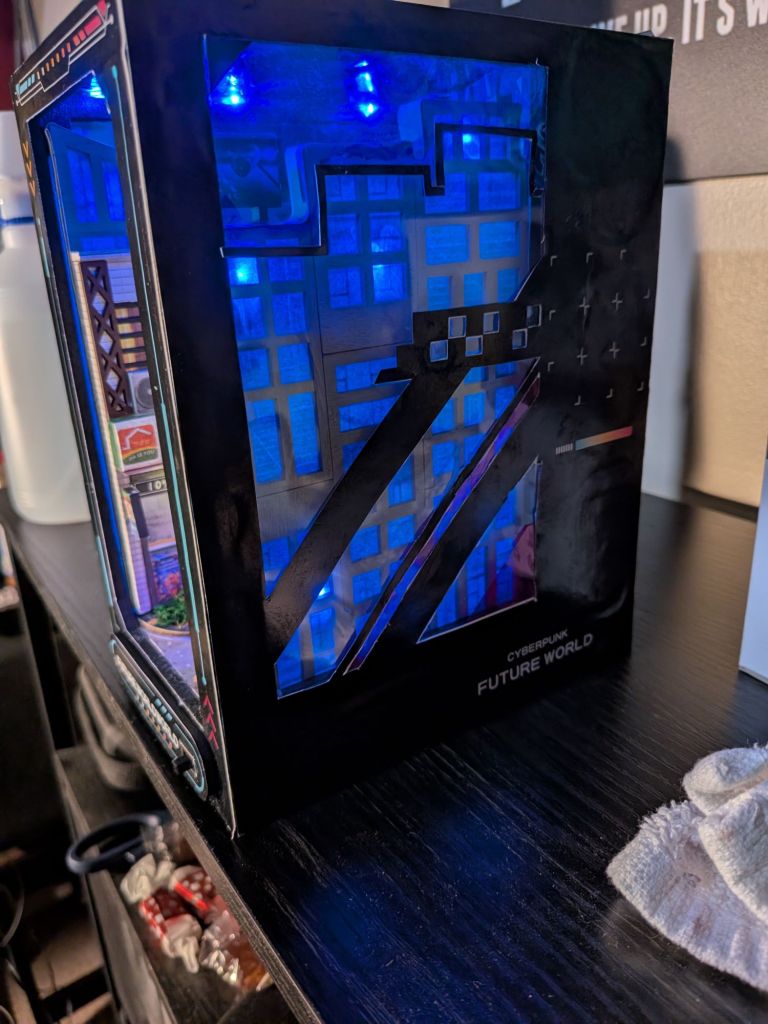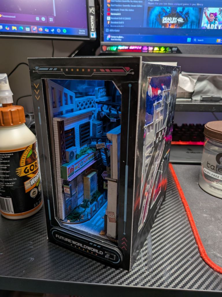 Here’s the deal with the second one. It was a delivery mistake, and I hadn’t actually ordered one of them for myself. I had ordered a handful of different DIY book nooks as Christmas gifts for my siblings, each one lovingly picked out to match something they enjoyed. One sister was magic, the other was photography. My older brother got one themed after a Sherlock Holmes-esque detective agency. My younger brother, with whom I share a lot of personal tastes in hobbies (more so than my other siblings) got one that was supposed to be cyberpunk themed.