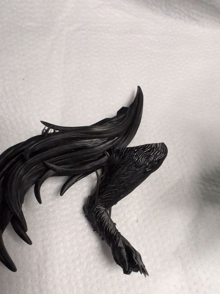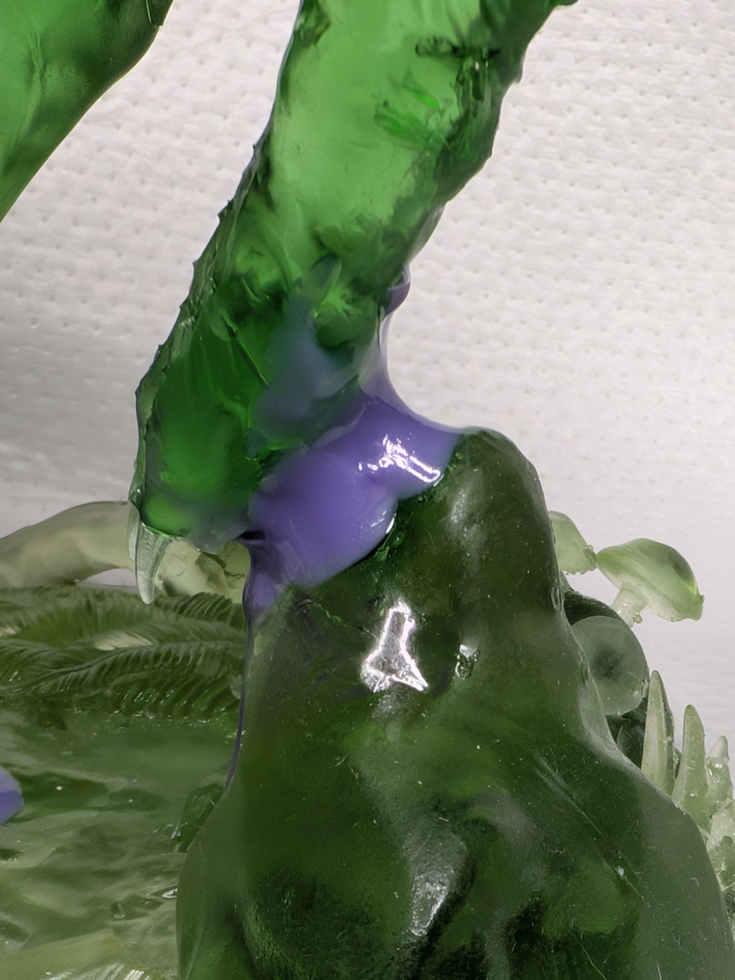 Thankfully it was just the one leg and the tail. Those were easy enough to set up in a new sliced file and reprint, but unfortunately I had run out of the black resin, or at least didn’t have enough left to feel comfortable with the attempt. (I really didn’t want a repeat of the printing process from the first attempt that ran low and failed to print the base.) That’s why I ended up using purple resin, as you can see by the replacements I used above.